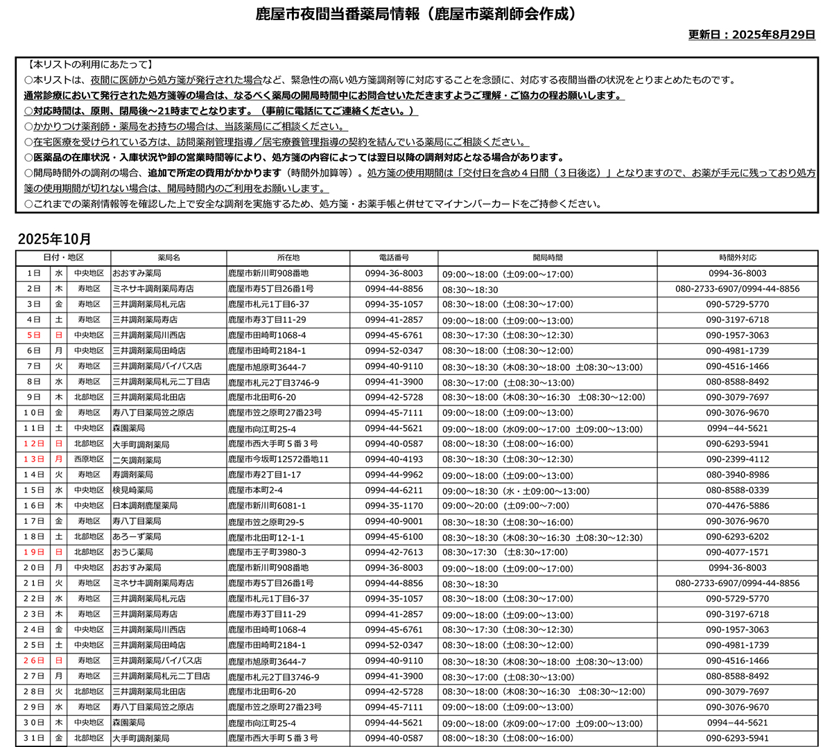 | 10月26日/ 日曜日 | おおすみ薬局 | 新川町 | 36-8003 |