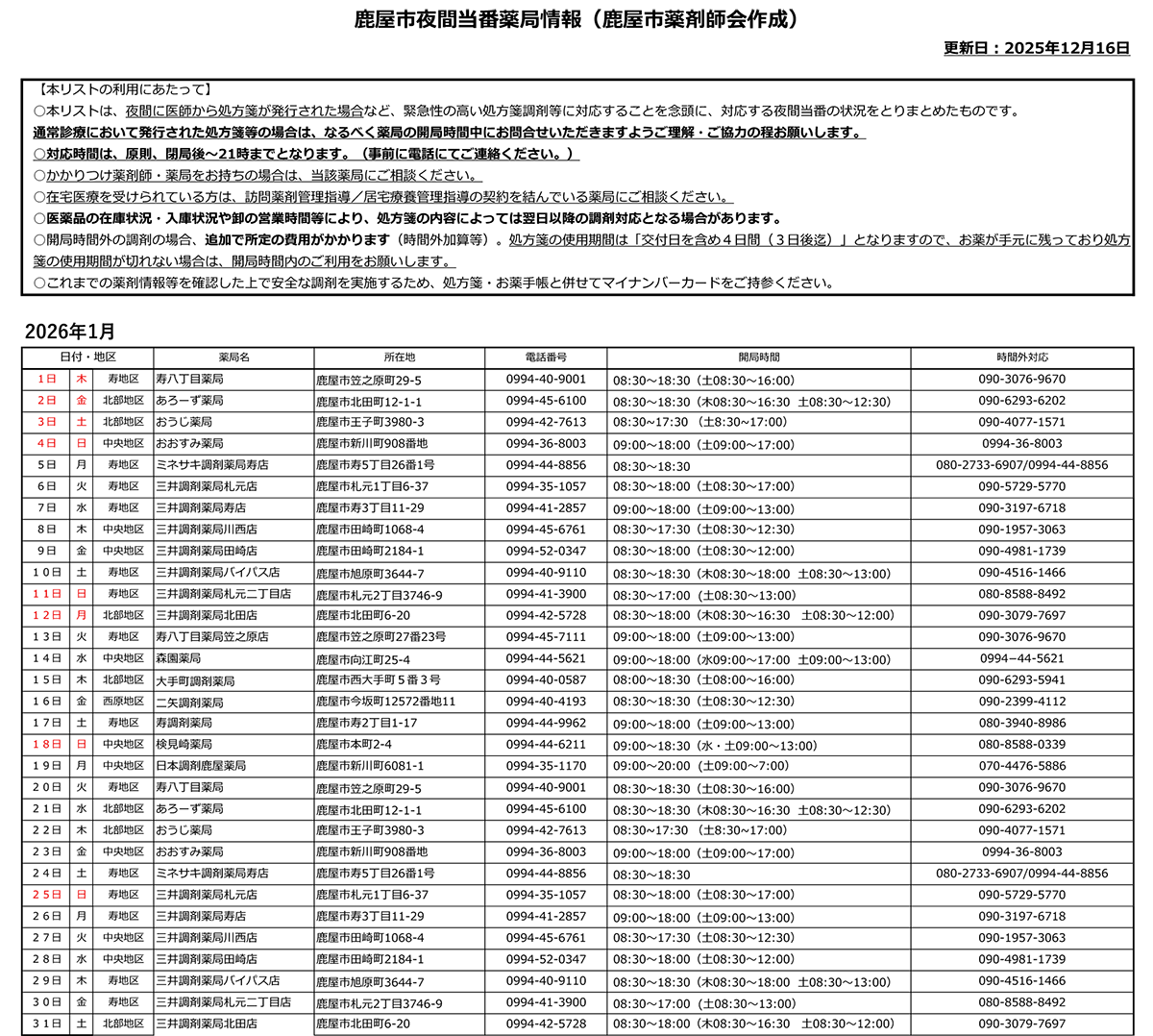 | 1月11日/ 日曜日 | 三井調剤薬局寿店 | 寿3丁目 | 41-2857 |