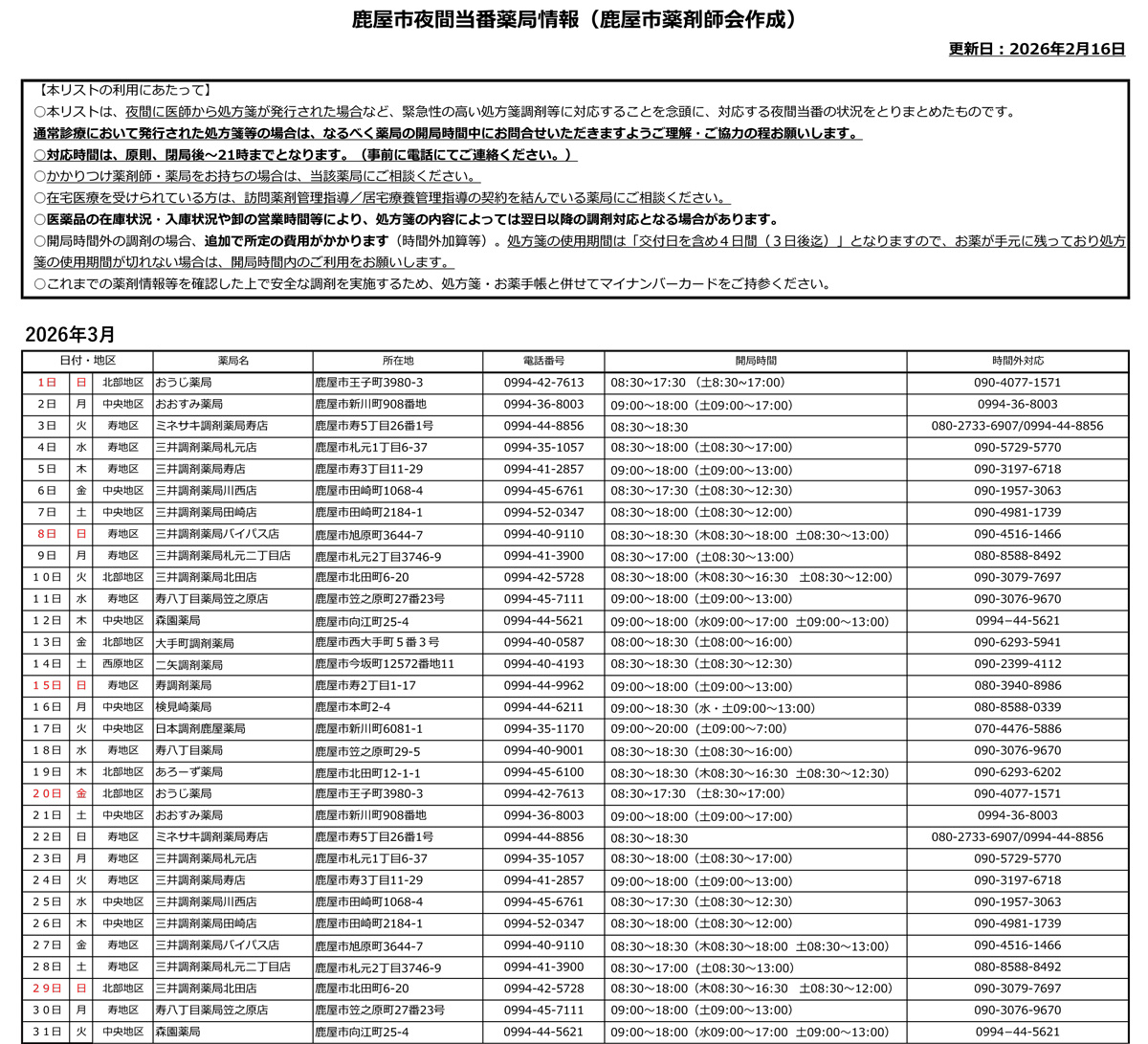 | 3月1日/ 日曜日 | 三井調剤薬局寿店 | 寿3丁目 | 41-2857 |