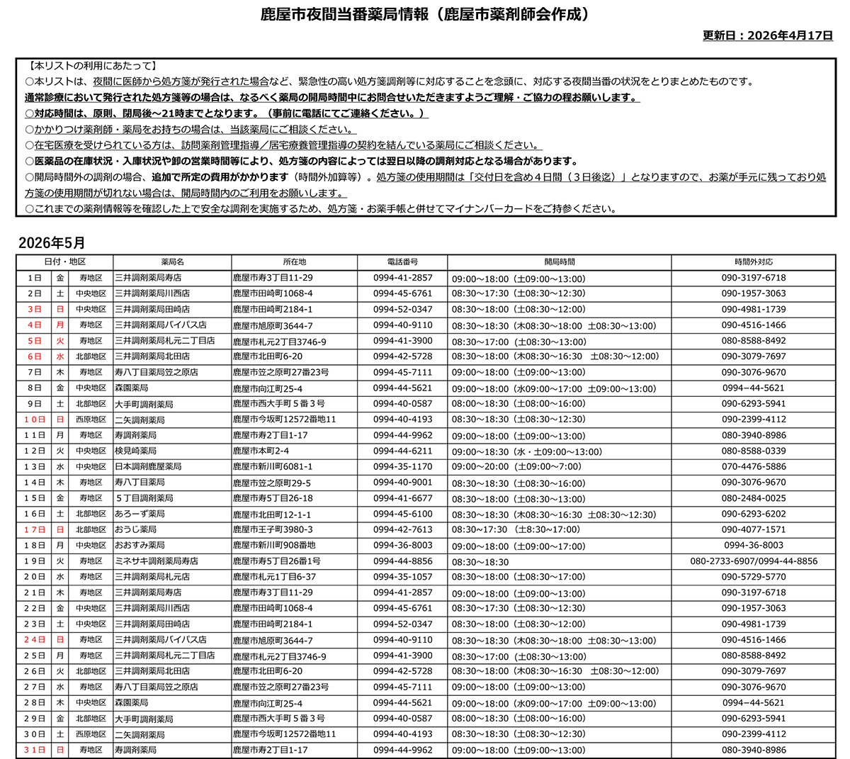| 5月17日/ 日曜日 | 寿八丁目薬局 | 笠之原町 | 40-9001 |