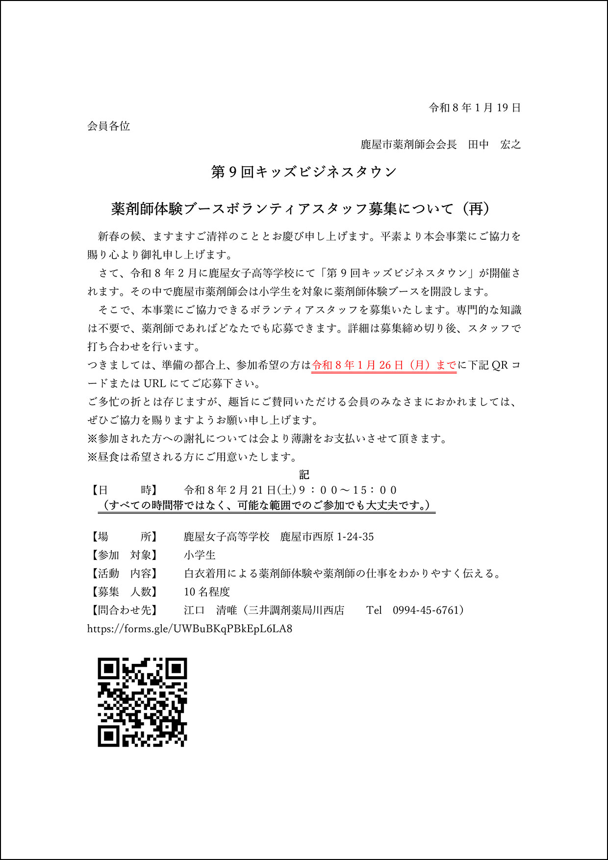 第9回キッズビジネスタウン 薬剤師体験ブースボランティアスタッフ募集について(再)