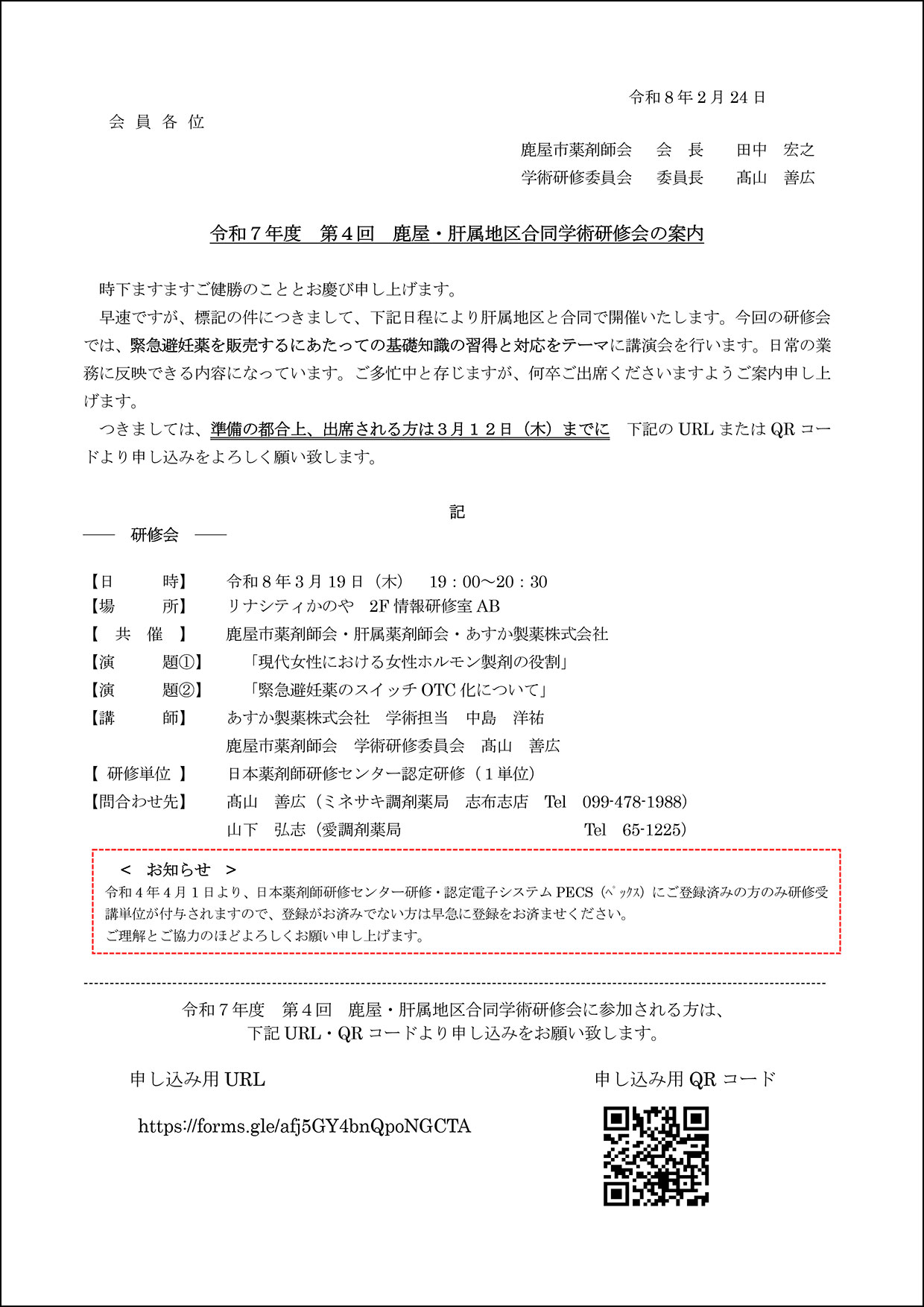 令和7年度第1回 鹿屋・肝属薬剤師会 合同県薬講習会の御案内